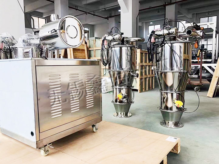 真空上料機(jī)由真空泵(無油、無水)或者羅茨風(fēng)機(jī)、不銹鋼吸料嘴、輸送軟管、PE過濾器(或316L不銹鋼過濾器)、壓縮空氣反吹裝置、氣動(dòng)放料門裝置、真空料斗和料位自動(dòng)控制裝置等組成,整套系統(tǒng)設(shè)計(jì)合理、制造精良。